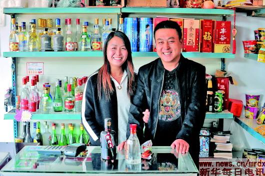 杜青春(右)和妻子韓麗英在小賣部里合影(2017年10月19日攝)。