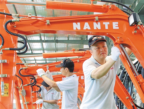 江西省高安高新技術產業園南特機械有限公司的“扶貧車間”里,員工在安裝設備。該市引導企業通過“企業+扶貧車間+貧困戶”的形式,帶動有勞動能力的貧困群眾脫貧致富。 彭松林 攝
