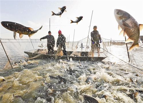 江蘇省盱眙縣河橋鎮漁民在捕魚。盱眙縣不斷探尋水產養殖業高質量發展之路,不斷提升當地群眾生活水平。 周海軍 攝