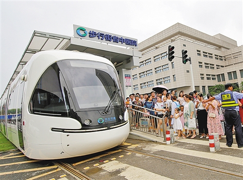 湖北省武漢市省中醫院門口,乘客在等待有軌電車。近年來,當地把地鐵、有軌電車、公交車和出租車站點安排在離醫院近的地方,讓百姓方便就醫。鄭傳海 攝