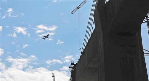重慶市黔江區境內在建的黔張常鐵路阿蓬江特大橋。近年來,黔江區加大立體交通建設,有力推動了當地經濟發展。 楊敏 攝