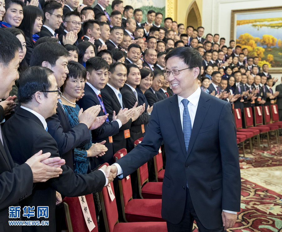 8月27日,中共中央政治局常委、國務院副總理韓正在北京人民大會堂會見香港特別行政區保安局局長李家超率領的香港紀律部隊文化交流團全體成員。 新華社記者王曄攝