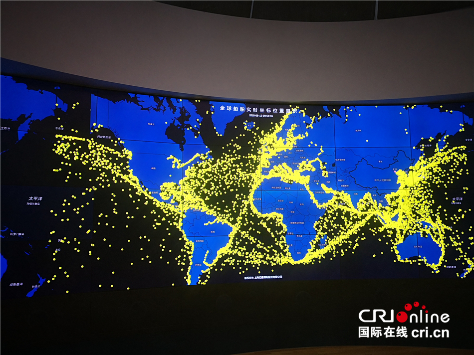 在上海國際貿易單一窗口運營方、上海億通公司的電子大屏上,密密麻麻的黃色光點顯示著全球船舶的實時坐標位置、上??诎稑I務動態等關鍵信息。