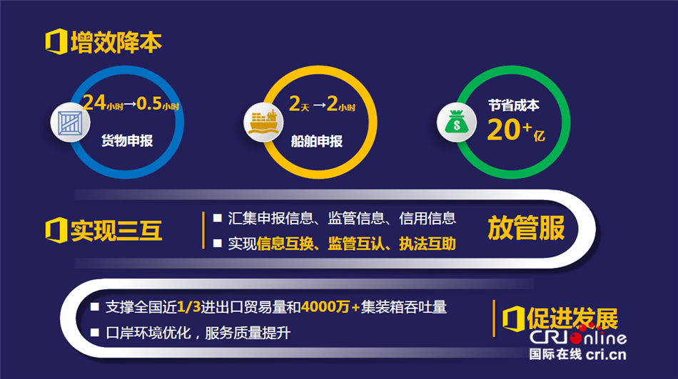 國際貿易單一窗口的運營,為貿易船舶進出上海港大大節約了時間和成本。辦通關手續實現了從“人跑路”向“信息跑路”的轉變,提交的資料由四套系統1113項數據簡化為一套系統388個數據,船舶進出港環節全流程從原來的2天縮短至2小時,貨物進出口申報環節全流程從24小時縮短至半個小時。