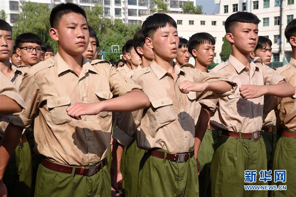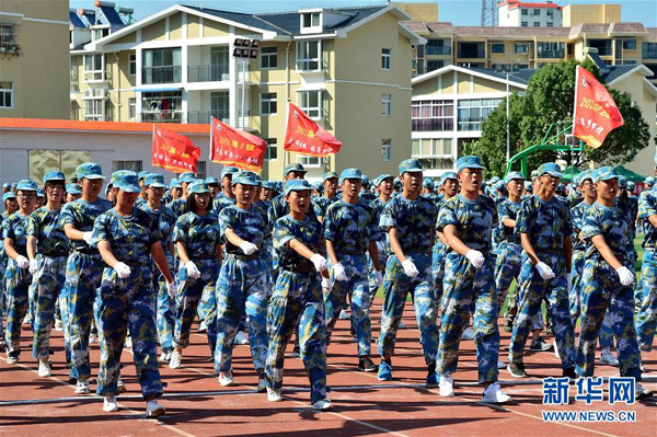 8月28日,新生在湖北省襄陽市??悼h第一中學參加軍訓。新華社發(楊韜 攝)