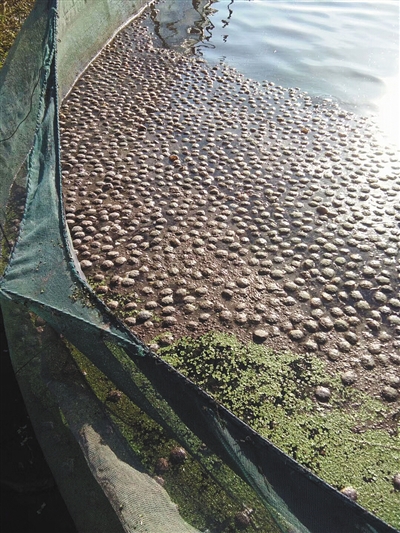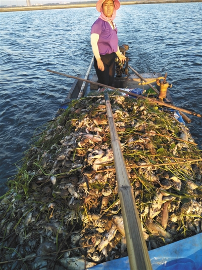 第二天,段廣玉發現,大閘蟹也開始大量死亡,并浮出水面?!按箝l蟹死了之后,先沉下去,再浮上來,所以晚了一天?!睆?6日到28日,不斷有死螃蟹浮出水面,段廣玉總共撈了五六船大閘蟹?!叭妓拦饬?,沒浮上來的也爛在湖里了,數量無法計算?!?/p>