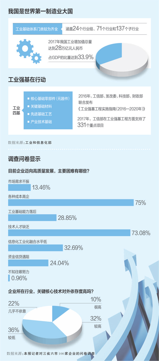 “要實現從‘有’到‘好’的轉變,在高端產品上突破,還需要時間?!闭{查中企業坦言,我國部分核心技術、關鍵產品和重大裝備仍存瓶頸制約,一些工業產品在一致性、穩定性和使用壽命方面與國外先進水平差距較大,工業基礎須進一步夯實。