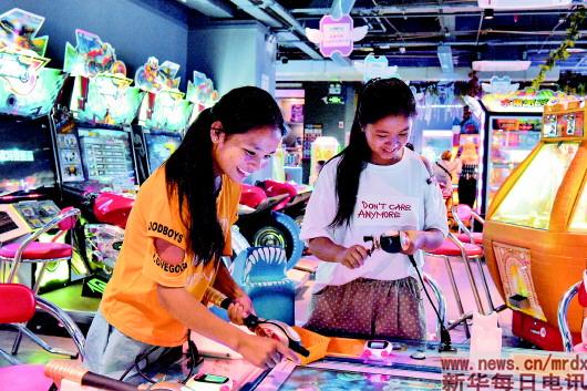 2018年8月21日,成都春熙路,阿來阿呷(右)和爾古依呷第一次體驗電玩。