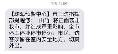 廣東珠海市民收到了來自珠海預警中心的短信:“切莫外出?!?/p>