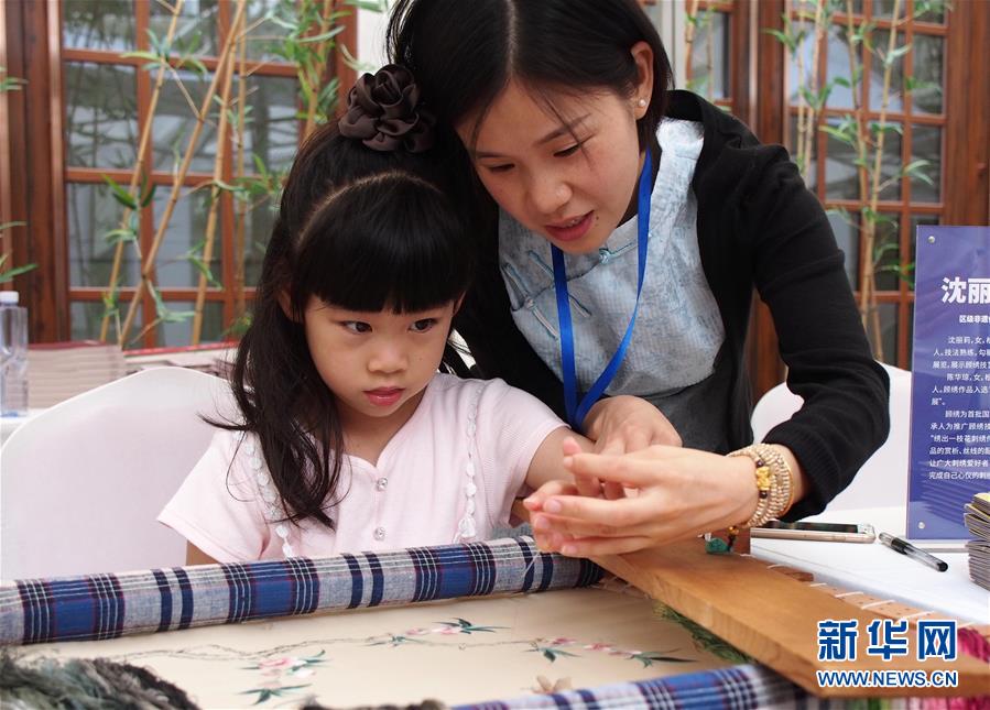 一位小女孩體驗國家級非物質文化遺產“顧繡”針法