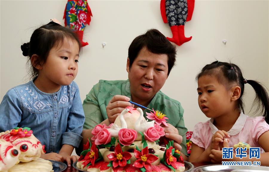 山東省棗莊市非物質文化遺產“魯南花饃”傳承人王欣(中)