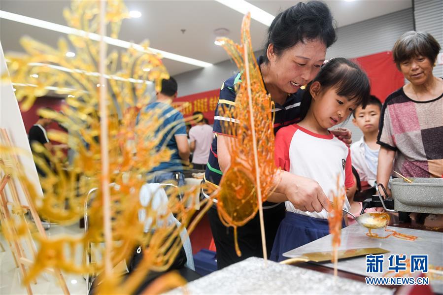 非遺傳承人張云萍(左)在教小朋友進行糖畫創作