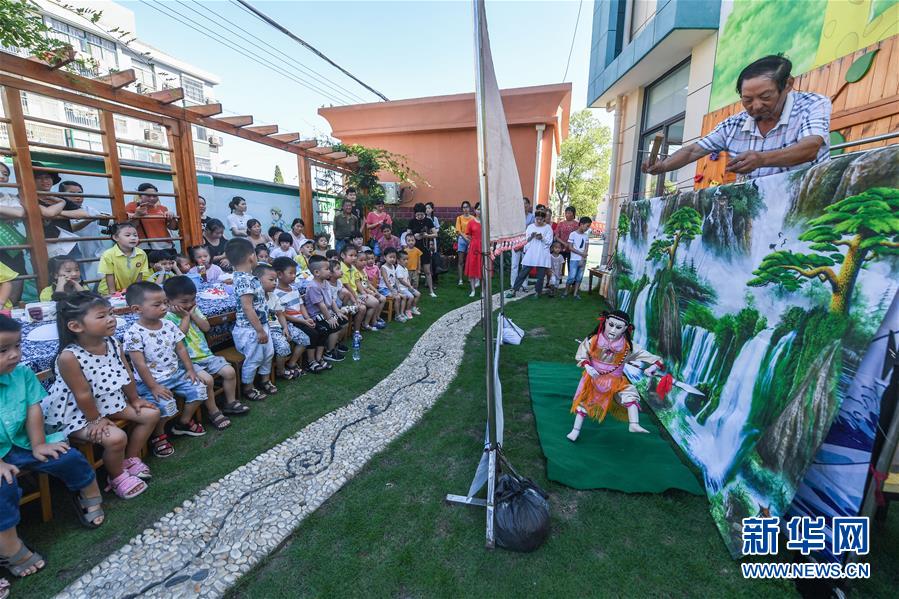 長興縣71歲的提線木偶藝人蔣晚寶在給孩子們表演提線木偶劇“哪吒鬧?!?/p>