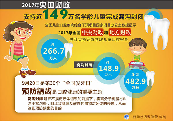 新華社北京9月18日電(記者陳聰)記者從全國兒童口腔疾病綜合干預項目國家項目辦公室了解到,2017年在中央和地方財政支持下,共有約149萬名7-9歲兒童從窩溝封閉項目服務中獲益,這些兒童齲齒發生得到了有效預防。