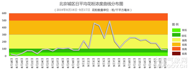 尹炤寅:同往年相比,今年北京秋季花粉的爆發期出現得相對較晚,原因是今年8月中下旬,北京的降雨較頻繁,也就是在花粉濃度即將升高時,雨水的濕沉降作用使空氣中的花粉顆粒降至地面,從而降低空氣中的花粉濃度。