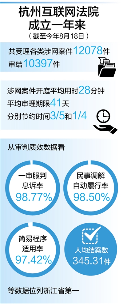 網上糾紛網上解,是設立互聯網法院的初衷之一。記者了解到,杭州互聯網法院發揮集中審理涉網案件的優勢,截至今年8月20日,共受理涉網案件12122件,審結10441件;發布電子商務審判、知識產權保護等白皮書3份,連續4次發布十大典型案例,進一步強化了司法裁判的導向性作用。