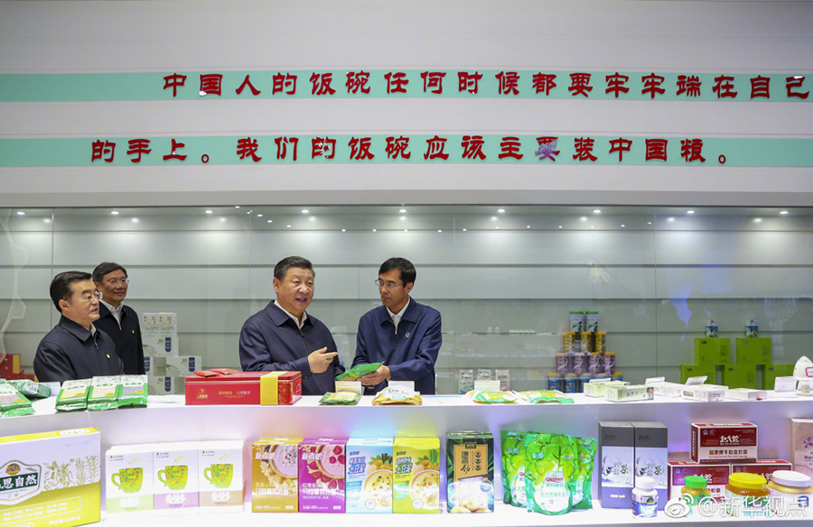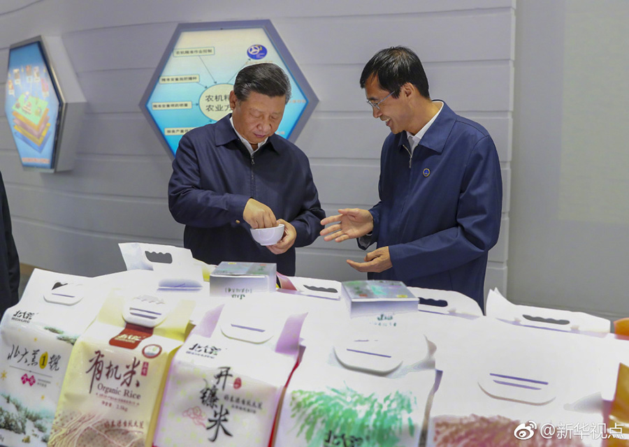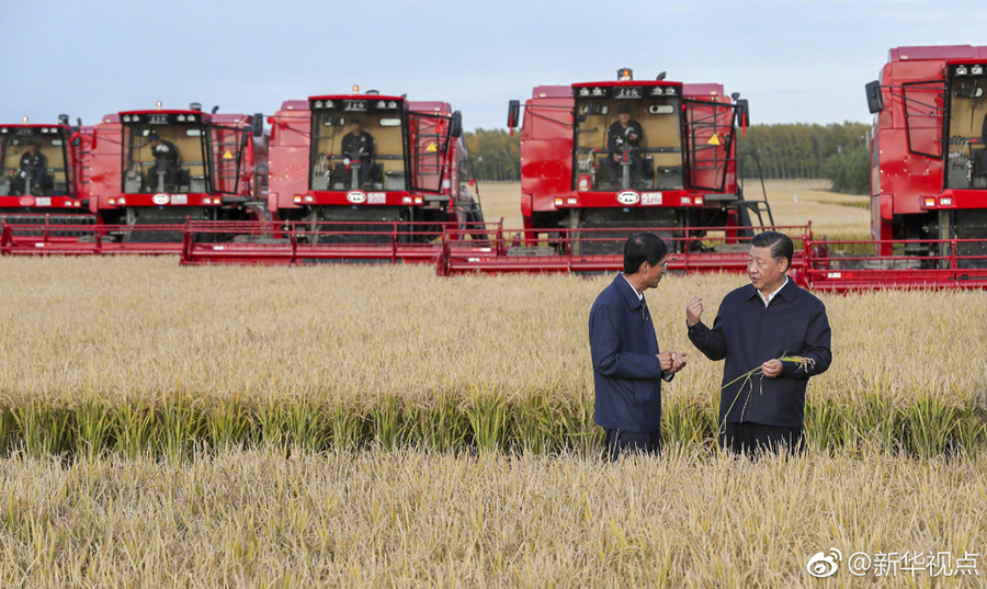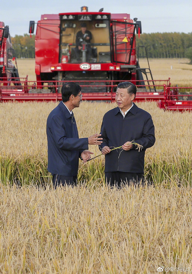 25日下午,首個“中國農民豐收節”剛過,習近平就深入三江平原腹地黑龍江農墾建三江管理局,考察糧食生產和收獲情況。他邊聽介紹,邊向農場負責人詢問今年收成如何、有沒有病蟲害、能否做到連年豐收,并強調中國人的飯碗任何時候都要牢牢端在自己的手上。在北大荒精準農業農機中心一樓大廳,當地出產的米油豆奶等各類農產品擺滿展臺。習近平走近前去,雙手捧起一碗大米,意味深長地說:“中國糧食,中國飯碗?!保ㄎ淖郑簭垥运?攝影:謝環馳)