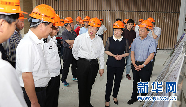 浙江省湖州市委副書記、市長錢三雄(前右三)檢查位于德清縣的首屆聯合國世界地理信息大會項目建設(2018年6月10日攝)。新華社發