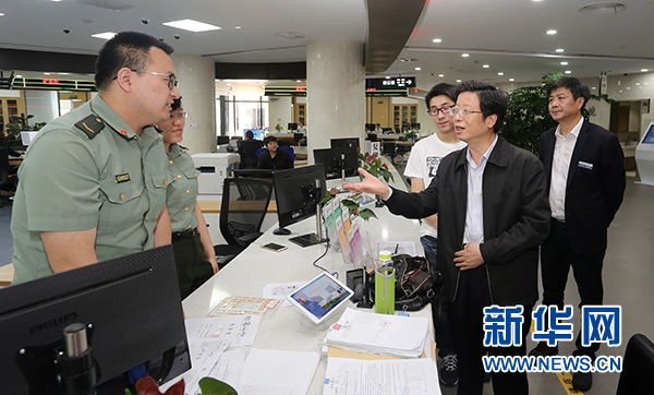 浙江省湖州市委副書記、市長錢三雄(右二)在湖州市民服務中心調研指導“最多跑一次”改革工作(2017年5月10日攝)。新華社發