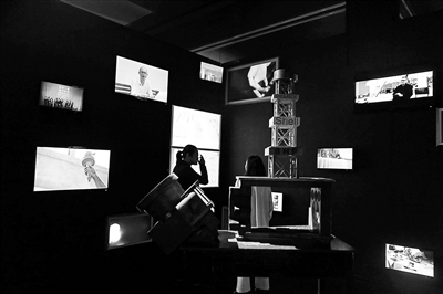黑色的背景營造出“時光隧道”的感覺、記錄年代關鍵詞的40個燈箱在“隧道”一側亮起,伴隨著參觀者的腳步,從1977年緩步走到2018年?!八淼馈钡牧硪粋葎t是與這些關鍵詞相關的藝術發展進程中的重要作品。而在展廳的中間,還陳列了一些珍貴的老物件。這是正在798國際藝術交流中心展廳舉辦的“行進中的歷史”,用年代記錄了藝術領域在改革開放以來的發展進程。