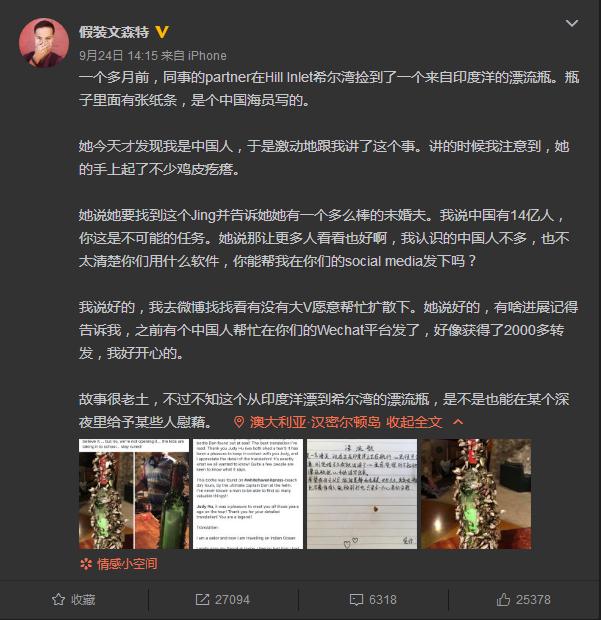 9月24日,知名旅游博主“假裝文森特”在微博發文稱,同事的伴侶凱特在澳大利亞的白天堂沙灘希爾灣撿到了一個來自印度洋的漂流瓶,瓶子里面有張紙條,是個中國船員寫的。信里道出了對未婚妻的無盡思念:“我是一名海員,現在正在印度洋上正在航行,心里很思念家中的未婚妻,剛訂婚不久我就出海了,心里感覺很對不起她,借著漂流瓶把心中的話寫出來。希望我回去以后,能跟晨靜和和美美,長長久久,其實呢,瓶子在深海中,也不奢侈有人能撿到打開,只是求一個心里的安慰?!币虼?,凱特非常希望能找到信中提到的未婚妻晨靜,告訴她她有一個多么棒的未婚夫。