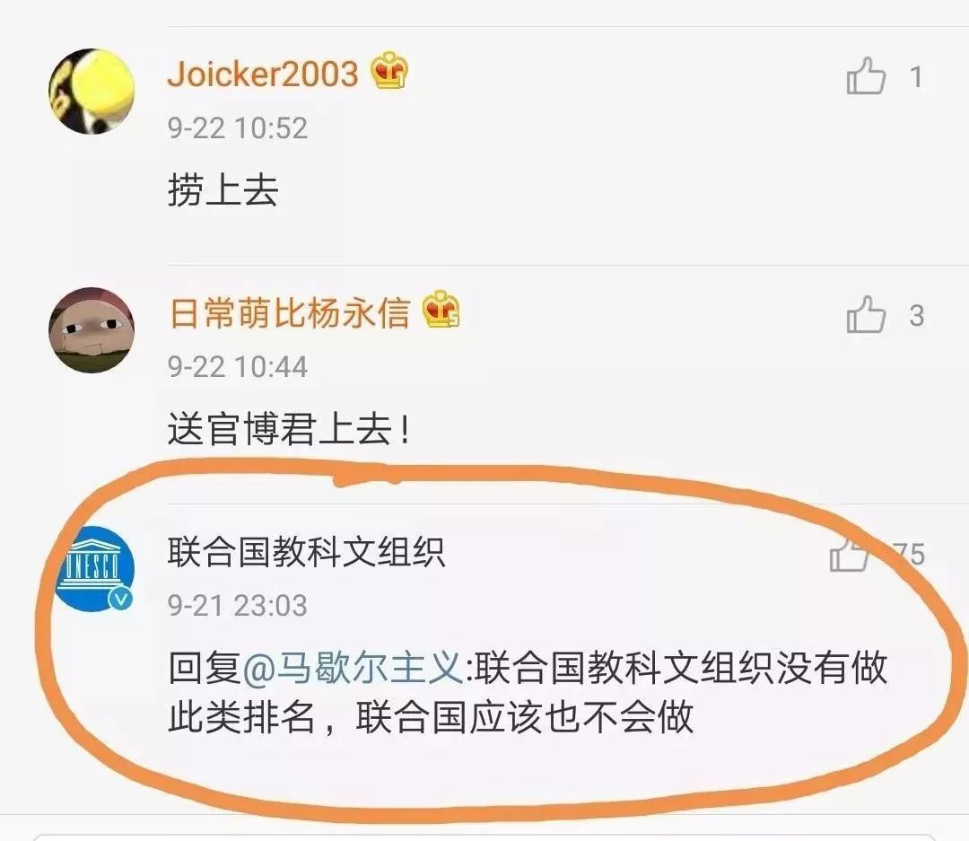 諷刺的是,“杜猛”還在微博最開始加了句“我先聲明一下,可能是聯合國教科文組織在造假?你忍心一下看完?!苯Y果聯合國教科文組織的官方微博當天就出來“強力打臉”,聲明“聯合國教科文組織沒有做此類排名,聯合國應該也不會做?!边@條微博被多名網友舉報,微博管理方最后對其做了“不實”的標記,對博主禁言15天,但這條假消息并未被刪,仍然掛在那里,甚是刺眼。而作者在被處理前還接著轉發了好幾條貶低中國的評論。