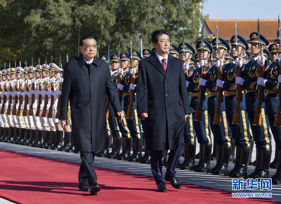 10月26日,國務院總理李克強在北京人民大會堂同日本首相安倍晉三舉行會談。這是會談前,李克強在人民大會堂東門外廣場為安倍晉三舉行歡迎儀式。 新華社記者李濤攝