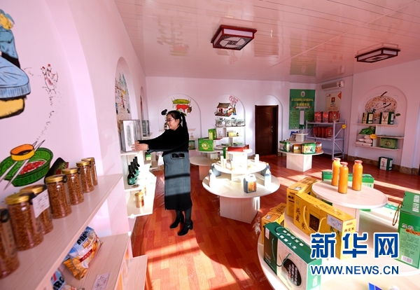 在山西省右玉縣殺虎口村,村民王彩霞在殺虎口村生態旅游專業合作社內整理當地特產(10月25日攝)。新華社記者 楊晨光攝