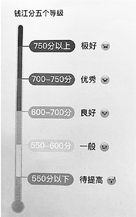 “錢江分”采用千分制,共分5個等級:當用戶分數低于550分,信用待提高;550~600分信用一般;600~700分信用良好;700~750信用優秀;750分以上用戶信用極好。