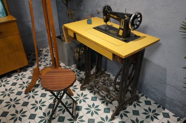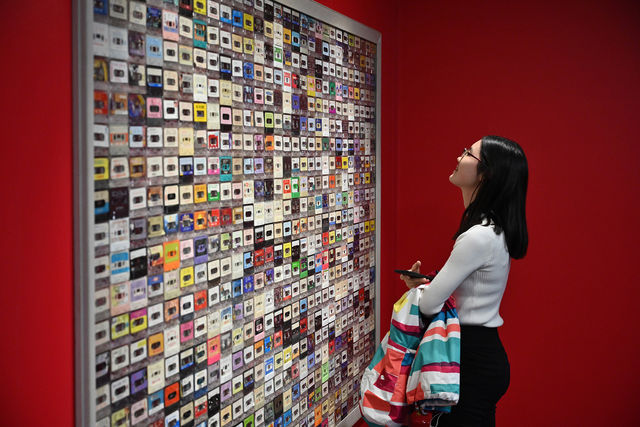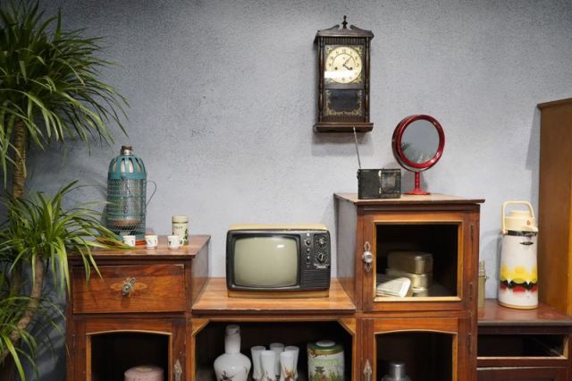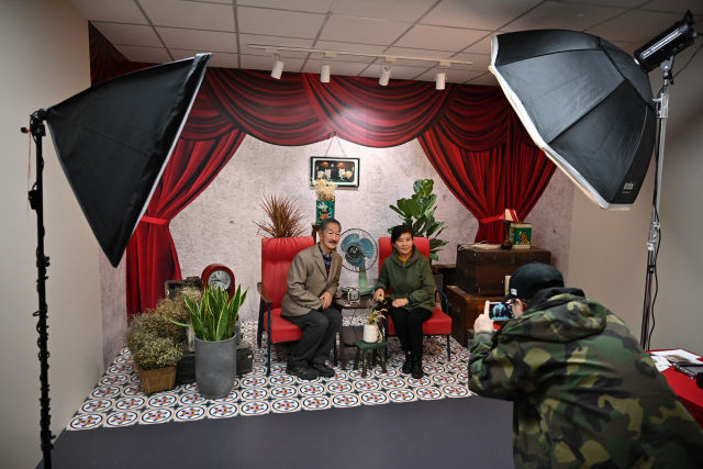 兩名參觀者在“時光博物館”里的年代照相館拍照留念。