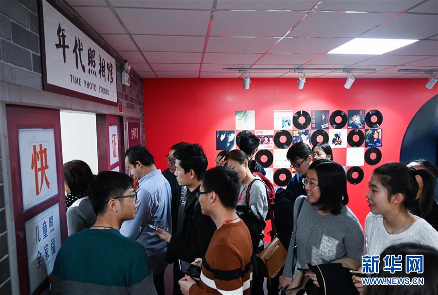 11月17日,觀眾在展覽上的“時光博物館”內排隊體驗年代照相館。 新華社記者 陳曄華 攝