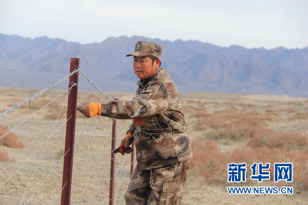 在新疆哈密市七角井鎮七角井村的老村附近,趙金閃在修復荒漠林圍欄(11月2日攝)。新華社記者孫哲攝