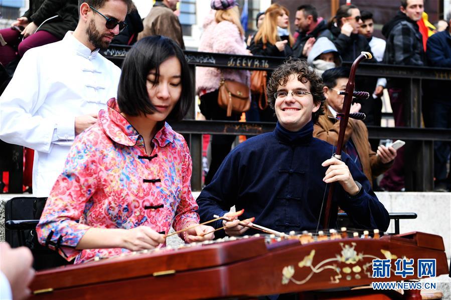 2018年2月11日,在西班牙馬德里,參加弘揚中國傳統文化的“快閃”藝術表演演員在索菲亞王后博物館前演奏民樂。新華社記者 郭求達 攝