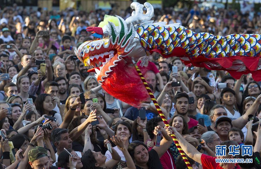 2018年2月10日,在阿根廷布宜諾斯艾利斯舉行的中國春節廟會上,觀眾拍攝舞龍。新華社發(馬丁·薩巴拉 攝)