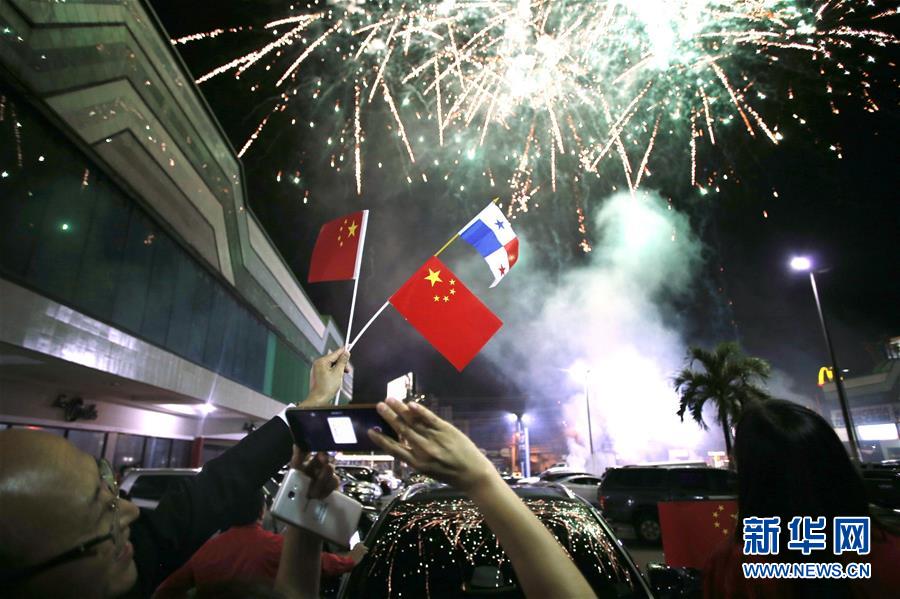 2017年6月12日,在巴拿馬首都巴拿馬城的華人社區,人們在巴拿馬與中國建交的慶?;顒由吓臄z煙花。新華社發(毛里西奧·巴倫蘇埃拉 攝)