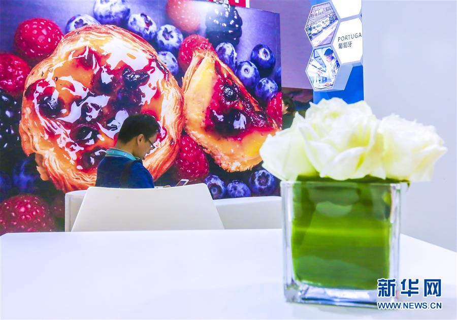 2018年11月6日,在中國上海,一位男士坐在中國國際進口博覽會的葡萄牙展區內。新華社記者 殷剛 攝
