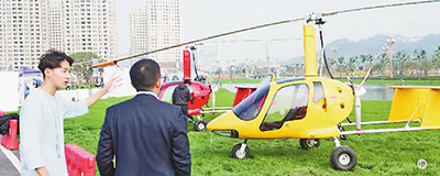 工作人員向觀眾介紹一款可搭載測繪儀器的自動旋翼機。新華社發