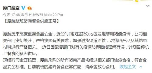廈航稱,廈航歷來高度重視食品安全,近段時間中國部分地區發現非洲豬瘟疫情,公司相關部門密切關注,嚴格按照有關要求,加強進貨渠道監管,對豬肉產品及其他原材料進行嚴格把關。近日,因配餐部門對有關疫情防御措施理解有誤,計劃暫停機上餐食的豬肉供應。