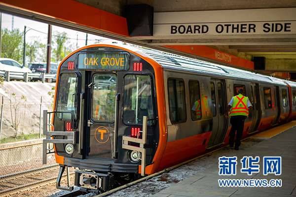 2018年5月15日在美國馬薩諸塞州梅德福德惠靈頓站拍攝的中車長客為波士頓橙線地鐵“量身訂制”的首批車輛。新華社記者 李木子 攝
