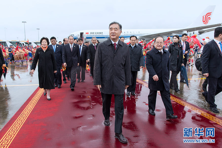 上午11時30分許,中央代表團乘坐的包機徐徐降落在停機坪上,等候在這里的500多人的歡迎隊伍爆發出熱烈掌聲和歡呼聲。汪洋走出飛機艙門,向歡迎群眾揮手致意。