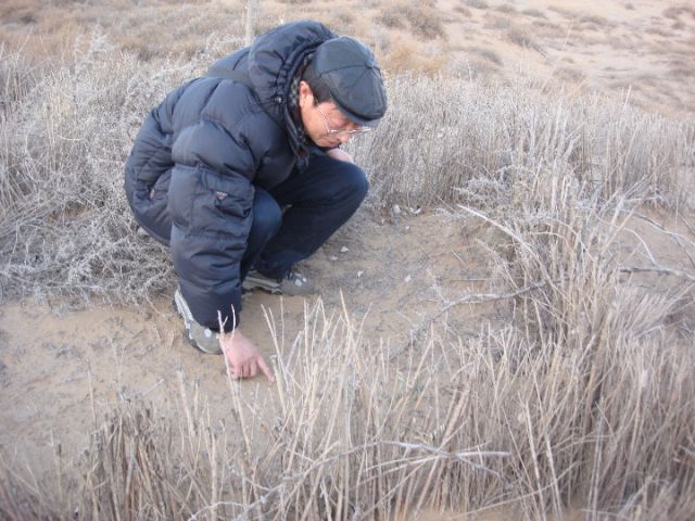 劉永定在沙漠調查藻類生物結皮。(受訪者供圖)