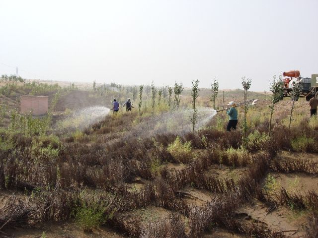 治沙人員向荒漠中噴灑藻類。(受訪者供圖)