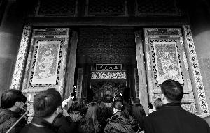 此次展覽從臘月初一展至三月初三,為期三個月,分為文物展覽和實景體驗兩部分。文物展覽位于午門正殿和東西雁翅樓展廳,共展出文物885件(套)。實景體驗部分包括整個紫禁城開放區域,都成為春節文化的展場,在宮殿門口會懸掛著寓意吉祥的春聯、門神(上圖),在廊廡下裝飾著華美的宮燈,在乾清宮的丹陛上下豎立著高大的天燈、萬壽燈,總共使用仿制品超過1000件。