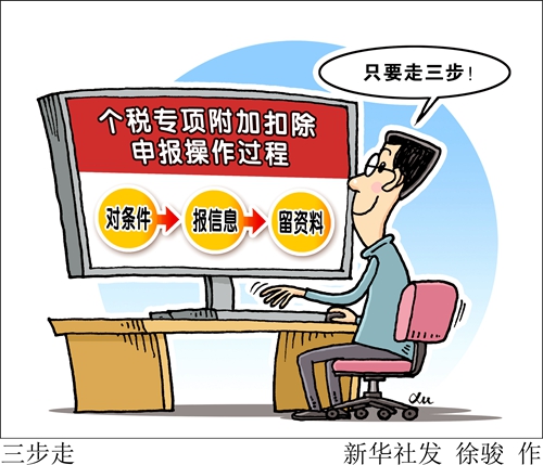 新華社北京12月24日電(郁瓊源、王錦萱)“對條件、報信息、留資料,納稅人要享受專項附加扣除,只需做到這三步?!贬槍{稅人如何才能享受到2019年1月1日起實施的個稅專項附加扣除,國家稅務總局總審計師劉麗堅24日在國務院新聞辦舉辦的國務院政策例行吹風會上回答了記者的提問。