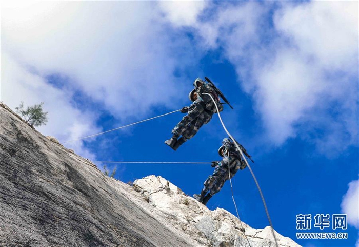 海軍陸戰隊某旅偵察營在三亞某地進行崖壁滑降訓練(11月20日攝)。新華社發(范旭東 攝)