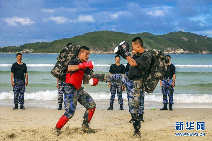 海軍陸戰隊某旅偵察營在三亞某海域組織特戰隊員進行沙灘格斗訓練(11月21日攝)。新華社發(范旭東 攝)