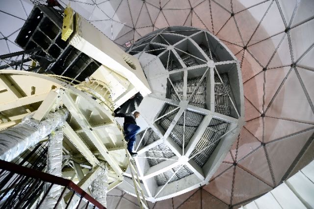 紫金山天文臺青海觀測站助理工程師張永興在檢查13.7米毫米波射電望遠鏡設備運行狀況。天文學家正利用這臺望遠鏡實施“銀河畫卷”工程。新華社記者張宏祥攝