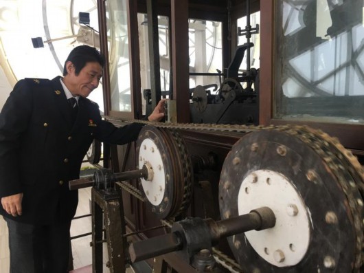 魏云寺在鐘樓機芯房檢查大鐘發條。(李曄 攝)