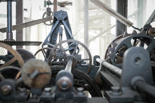 大鐘機芯內,大量齒輪互相咬合,直徑超過12毫米的鋼絲繩代替了普通鐘表中精細的鋼絲。(海沙爾 攝)