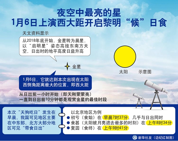 新華社天津1月4日電(記者周潤?。τ谔煳膼酆谜邅碚f,本月6日注定會是一個忙碌的早晨,看完西大距的金星,就可以繼續欣賞一次精彩的日偏食。